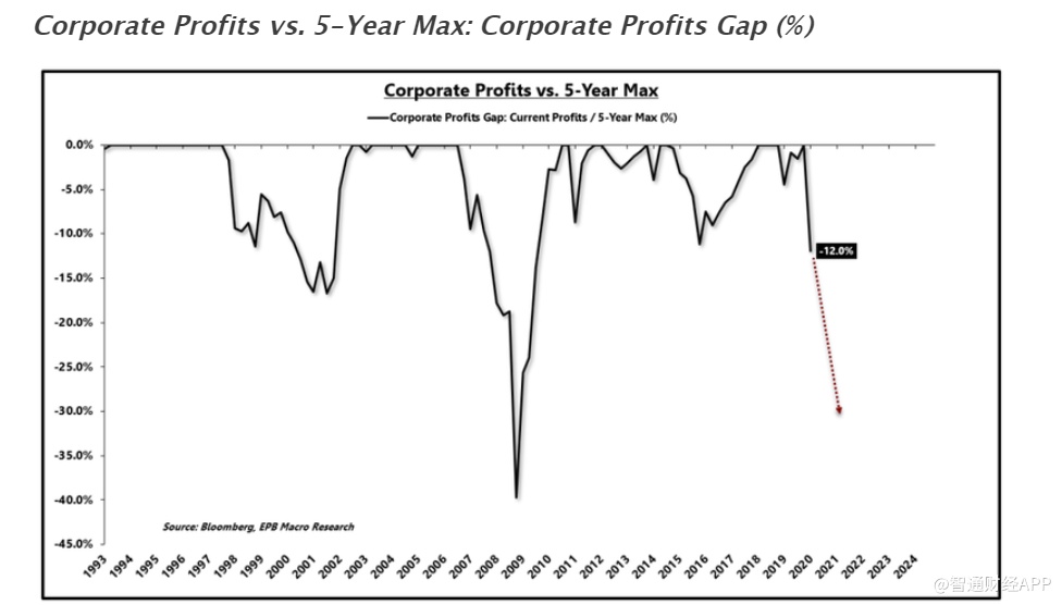 用上面同样的方法计算收益差值,可以得到,2000年和2008年的经济衰退期间,企业税前利润较峰值分别下降了15%和40%。