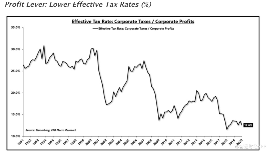 令人担忧的是,在过去30年里,实际税率一直在大幅下降,夸大了每股收益或税后利润相对于实际利润的增长。