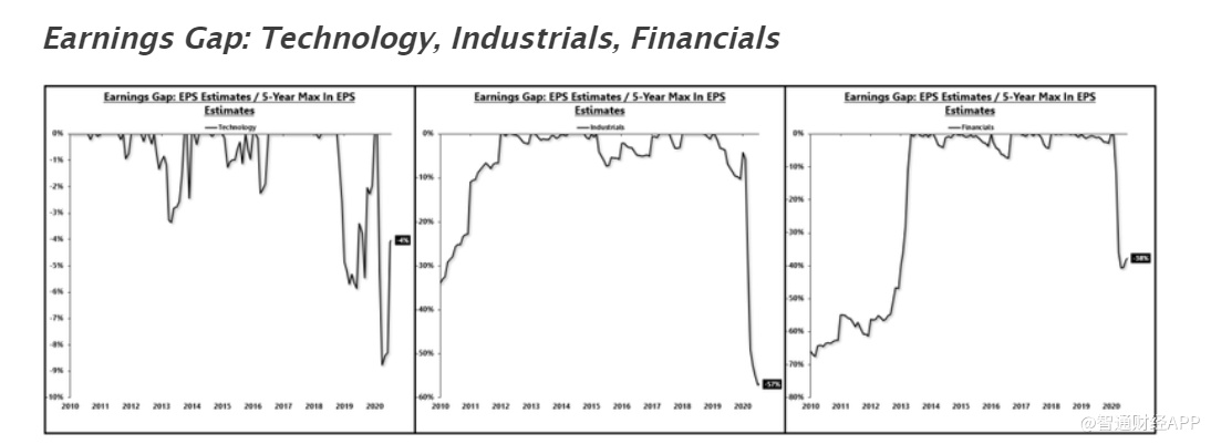 科技股的收益预期仅比历史高点低4%,而工业股和金融股的收益预期分别比历史高点低57%和38%。
