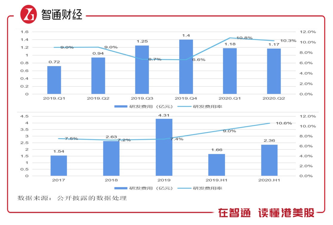 在华米的各项费用中,研发费用一直是大头。该公司积极打造自主品牌,将研发支出更多地用在自主产品上,同时也持续加大自主品牌的营销推广力度。2020年第一季度及第二季度,研发费用率创下最高纪录水平,两个季度该数字均超过10%,整个上半年为10.6%,较2017年高出3.1个百分点。
