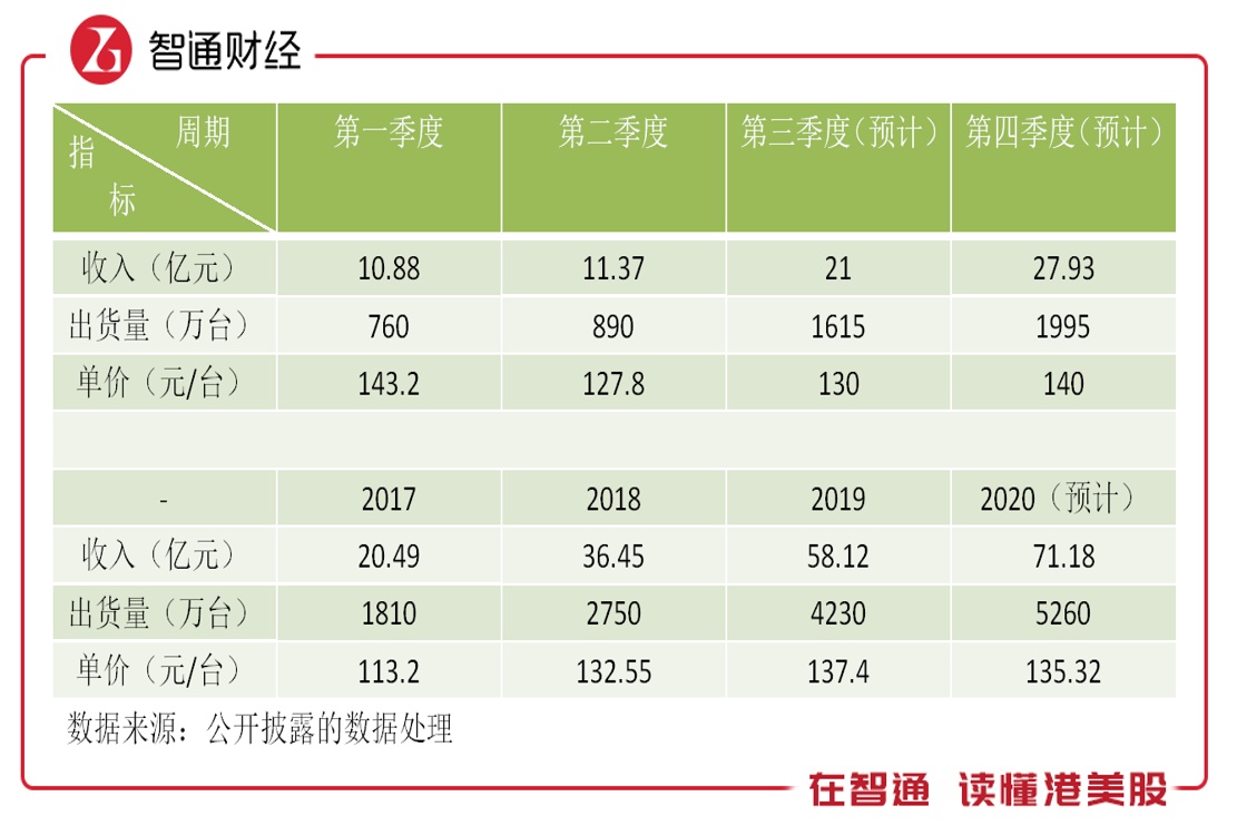 从往年看,该公司出货单价处于持续提升的趋势,不过2020年受卫生事件影响,预计会有小幅下滑,主要为第二季度出货单价下降幅度较大,但预期第三季及第四季度将得到提升,整体2020年的出货单价预计135元左右。预计该公司全年出货量将达5260万台,同比增长24.35%,收入71.18亿元,同比增长22.5%。