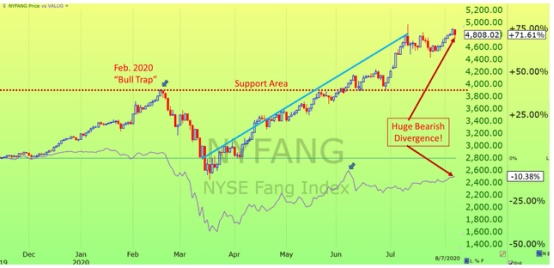 为了使指数保持相同的增长速度,FAANG不得不发挥更大的作用。下图为NYFANG指数(烛型)与更具代表性的VALUG指数(紫线)的对比图,可以更好地了解大多数股票的实际走势。