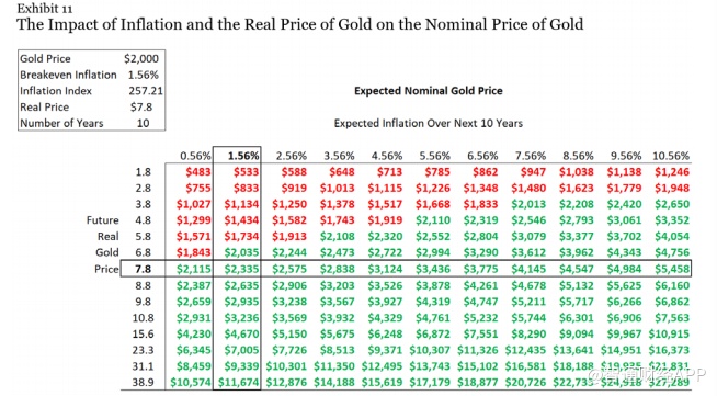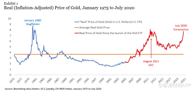 他们总结道,”黄金价格的变动一直是未来通货膨胀的无用预测。然而,在1980年和2011年,黄金实际价格高企,与人们普遍认为未来通胀将非常严重的观点一致。但事实证明,这些的观点是错误的。也许这次不同,公共卫生事件带来的一个经济后遗症将是10年的高通胀。就像1980年和2011年一样,对未来高通胀的预期已经计入了黄金价格。未来十年黄金价格的变化将在很大程度上取决于黄金实际价格的变化。”