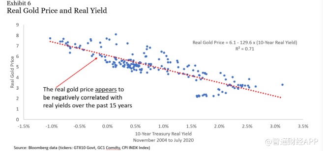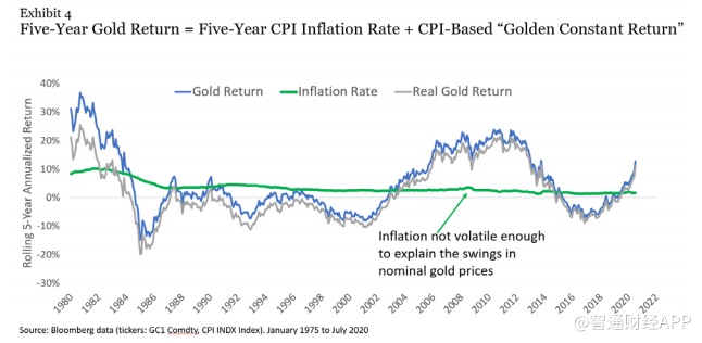 他们还发现,在五年的时间跨度内,黄金的表现几乎完全可以用黄金实际价格的变化来解释。