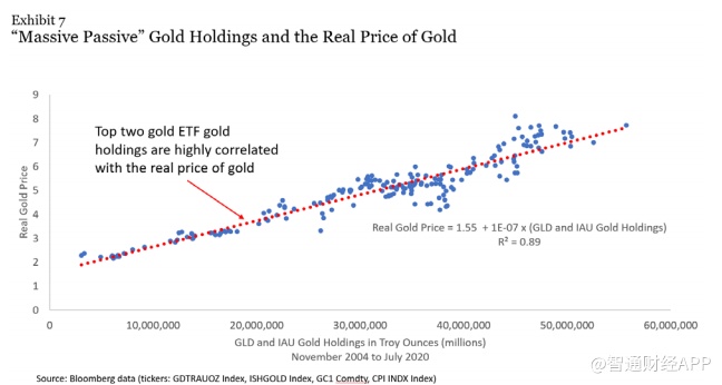 如果过多的资金追逐有限的黄金,那么“大量被动投资者”持有的黄金就会越来越多,黄金的实际价格就可能上涨得越高。当然,被动投资者出售持有的黄金也可能会降低黄金的实际价格。