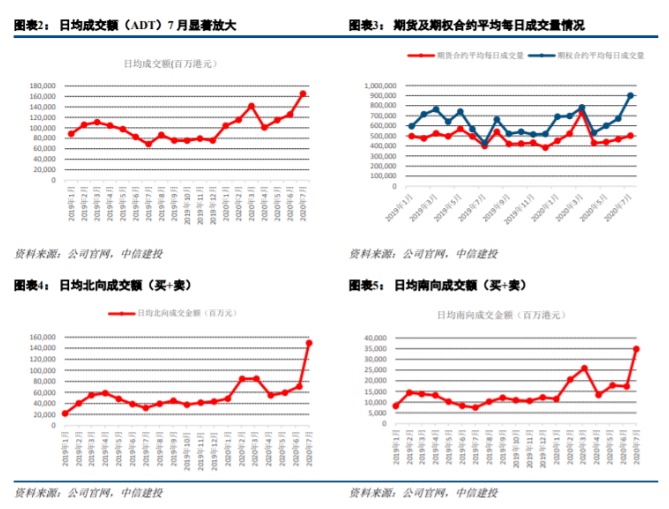 2020年7月以来,现货市场成交额显著放大,7月平均每日成交额为1651亿港元,同比增长140.3%,环比增长31.5%,而8月前两周的平均每日成交额亦达到1353亿港元,同比增长56.7%。互联互通市场成交额放大更为明显,7月平均每日北向成交额为1495.3亿元,同比增长368.4%,环比增长111.1%,每日南向交易额为348.7亿港元,同比增长369.4%,环比增长101.4%,8月前两周虽环比略有下降,但仍维持强劲。期权市场在7月亦表现显著活跃,每日平均成交张数为90万张,同比增长110.4%,环比增长34.3%;期货市场则在7月每日平均成交张数为50.2万张,同比增长25.9%,环比增长7.6%。鉴于2019年三季度基数较低,我们预计公司三季度业绩有望高增速。