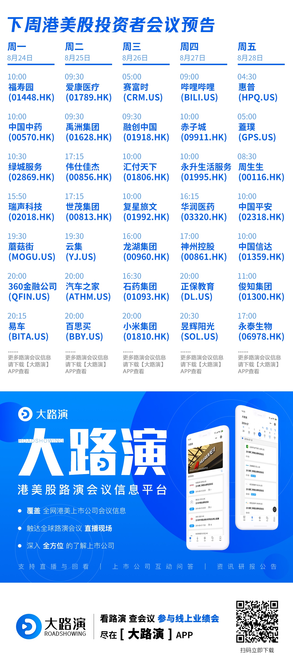 以下是“大路演”为您整理的下周(8月24日-8月28日)港美股上市公司会议日历。
