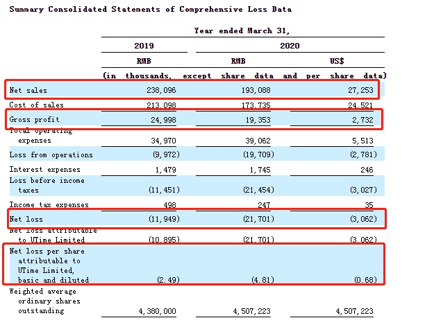 根据其最新招股书,截止3月31日的2020财年,公司净销售额为1.93亿元(人民币,下同),同比下降18.9%。