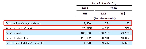 截止2020年3月31日,公司拥有现金及现金等价物为55.4万元,总资产为1.68亿元,总负债为1.28亿元。上年同期公司拥有现金及现金等价物为740.8万元,总资产为1.88亿元,总负债为1.71亿元。