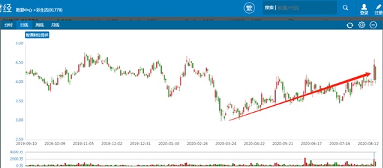 二级市场方面,公共卫生事件影响下股票一片哀鸿,但其后对资本市场影响逐步减弱,而且物业更因价值体现和稳定现金流等因素反而得益。自3月24日之后,彩生活股价便一路上行,截止8月18日的累计涨幅接近50%,其中8月18日盘中最大涨幅一度冲到14.4%,最终收盘定格在10.7%,当日共计8384.1万港元资金涌入成交1916.5万股,交易量较前一个交易日放大近4.2倍,呈现明显的放量冲涨。虽然公司股价于8月19日大盘指数走弱情况下出现回调,但是股价整体上行态势并未被破坏,并且当天成交金额也比前一日减少36.7%,一定程度表明仍有不少资金并未离场。