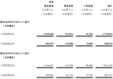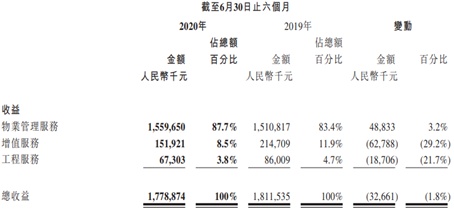 对应到营收方面,物业管理服务业务得益于2019年3月底完成收购北京达尔文以及部分其它项目转为包干制物业管理项目,带动包干制收取服务费的收入同比增加1.42亿元,抵消交付前服务和物业管理顾问服务费的减少,物业管理服务业务收入同比增长3.2%至15.6亿元。增值服务和工程服务业务,因公司进行业务转型的战略和疫情影响,2020年上半年分别同比减少29.2%、21.7%至1.52亿元和6730.3万元。但因为营收占比8成以上的物管业务稳定,最终带动营收总规模稳定在17.79亿元,仅小幅下滑1.8%。