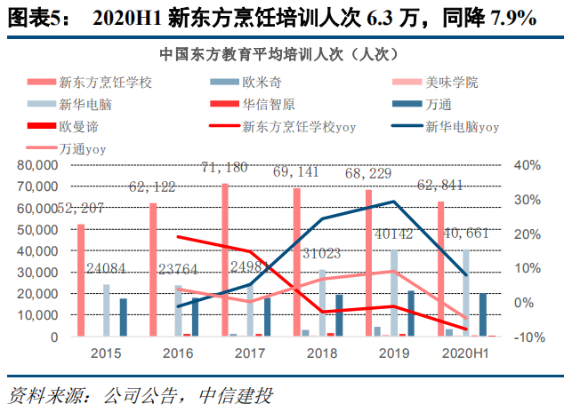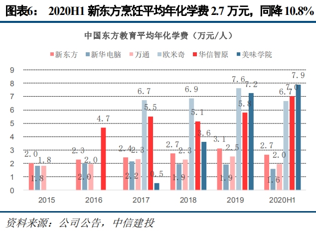 平均培训人次小幅下降,收入确认时间延长拉低年化学费水平。2020年上半年公司平均培训人次12.8万,同降3.8%。其中短期课程、1-2年课程、2-3年课程培训人次分别同降20.4%、30.2%、13.7%,3年期课程培训人次同增34.7%,3年期课程培训人次在公共卫生事件下有较大增长主要是往年新学校的低年级学生升入高年级,带动3年期课程总人数提升所致。2020年上半年公司平均年化学费(剔除分部间销售)2.35万元,同降13.9%。其中新东方、新华电脑、万通汽车、欧米奇平均年化学费分别为2.65、1.59、1.96、6.66万元,分别同降10.8%、13.9%、16.7%、9.3%,主要系公共卫生事件之下,学校线下2至4月份课程向后推迟,学生收入确认时间延长所致。华信智元、美味学院平均年化学费分别为7.02、7.90万元,分别同增16.5%、64.8%。