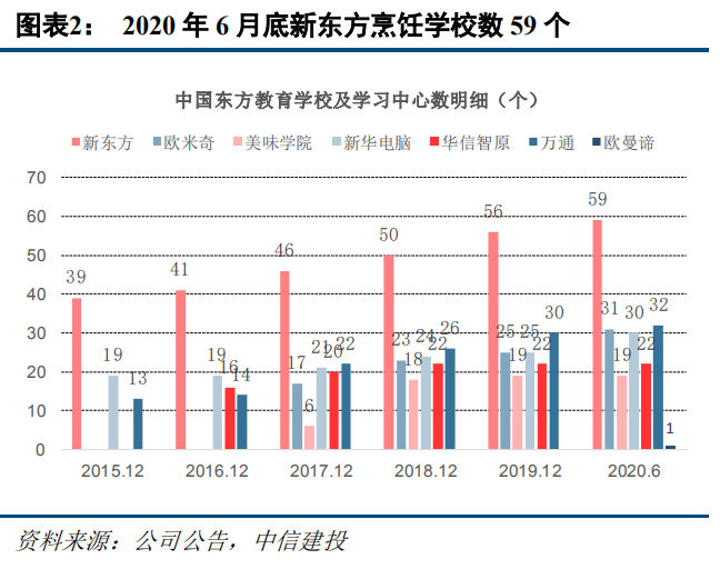 新学校开设稳步推进,欧曼谛启动招生开启公司美业版图。截至2020年6月底,公司开办的学校及中心达194个,较上年底增加17个。其中新东方、欧米奇、美味学院分别新开3、6、0个,总学校及中心数分别达59、31、19个。新华电脑、华信智原、万通汽车分别新开5、0、2个,总学校及中心数分别达30、22、32个。公司时尚美业学校欧曼谛已于2020年5月正式开学,上半年新培训人次247人,公共卫生事件之下招生效果超预期,全年招生规模有望超过600人。与此同时,公司孵化的酒店管理专业已在贵州、郑州等地试运营,集团品牌版图未来有望进一步扩张。