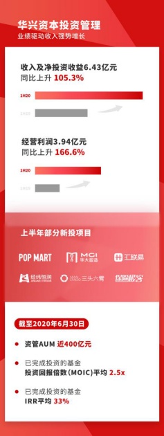 经过多年布局耕耘,华兴资本投资管理业务厚积薄发,在2020年上半年贡献收入6.43亿元,同比大增105.3%,分部经营利润达人民币3.9亿元,超过去年全年表现。