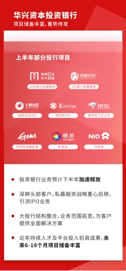 在立足中国市场,深耕头部客户资源的背景下,华兴适时推进投资银行业务板块结构整合,拓宽业务范围,为客户提供全面资本市场解决方案。上半年,华兴资本参与多个标志性的一、二级市场交易: