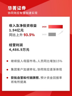 2020年前6个月,华菁证券实现收入1.94亿元,同比上升93.5%。继2019年扭亏为盈后,今年上半年经营利润大幅增加至4487万元。