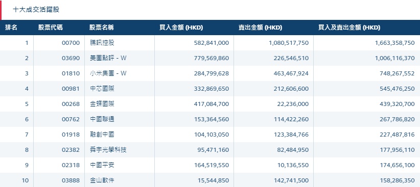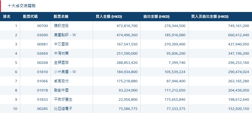 港股通(沪)十大活跃成交股