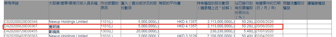 智通财经APP获悉,香港联交所最新资料显示,8月20日,董事会主席黄朝阳增持中骏集团控股(01966)500万股,每股作价4.1357港元,总金额约为2067.85万港元。智通财经APP获悉,增持后最新持股数目为21.13亿股,最新持股比例为50.28%。