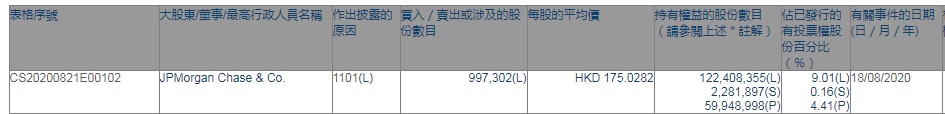 智通财经APP获悉,香港联交所最新资料显示,8月18日,摩根大通增持药明生物(02269)约99.73万股,每股作价175.0282港元,总金额约1.75亿港元。增持后最新持股数目约为1.22亿股,最新持股比例为9.01%。