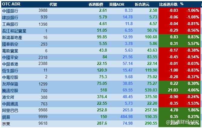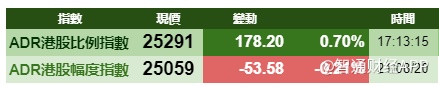 智通财经APP获悉,周五美股三大指数上涨,刺激港股ADR指数全日向好,按比例计算,收报25291点,升178.20或0.70%点。