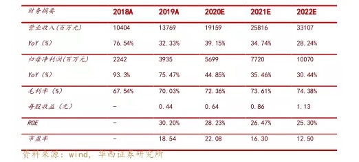 预计公司2020-2022年实现收入分别为191.59/258.16/331.07亿元,分别同比增长+39.15%/+34.74%/ +28.24%,归母净利润分别为56.99/77.20/100.70亿元,同比增速分别为+44.85%/+35.46%/+30.44%,对应PE分别为22/16/13倍,首次覆盖,给予“买入”评级。