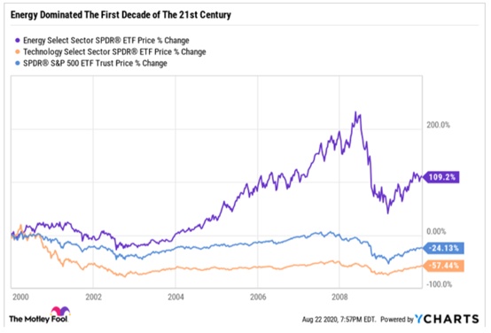 许多像微软(MSFT.US) 这样的科技巨头在21世纪初的市值堪比石油巨头,但石油巨头很快就把它们甩在了后面。在这十年里,投资能源股能让资金翻倍,而对科技股的投资则会让资金减半甚至更多。