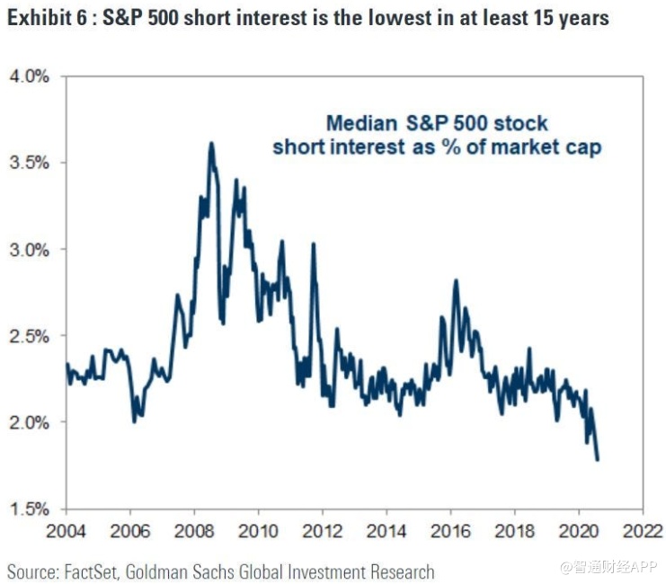 高盛的数据显示标准普尔500指数成份股的未偿空头权益中值仅相当于其市值的1.8%。为近年来的最低点。