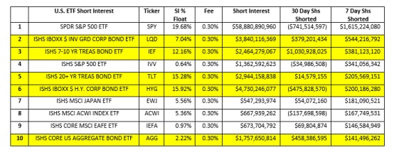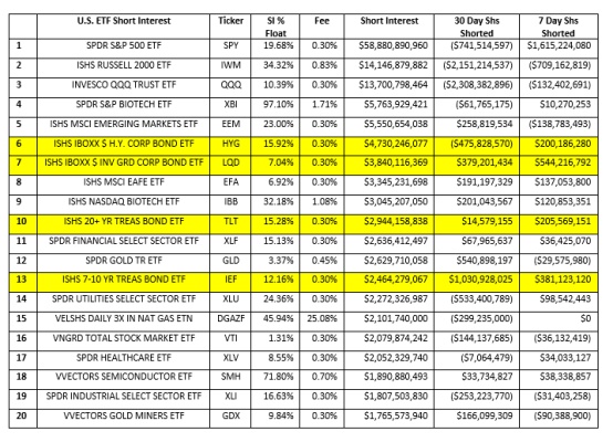 尽管投资者对于市场或经济出现问题时,美联储将在未来几轮宽松政策期间购买ETF的情况感到担心,但市场对固定收益ETF的做空仍很强劲。根据数据显示,在做空最多的20只ETF中包括了4只固定收益ETF:债券指数ETF-iShares iBoxx高收益公司债(HYG.US)、债券指数ETF-iShares iBoxx投资级公司债(LQD.US)、iShares 安硕20年期以上美国国债(TLT.US)和债券指数ETF-iShares Barclays 7-10年(IEF.US)。相比在1月份被做空最多的100只ETF中,只有8只固定收益ETF,目前做空ETF中已经有14只固定收益ETF。