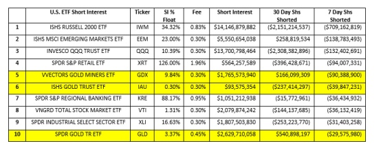 第三个趋势是在过去的一周内对黄金相关ETF的空头回补。可以看到,VanEck Vector 金矿开采商ETF(GDX.US)、黄金信托ETF-iShares(IAU.US)和黄金ETF(GLD.US)在上周均跻身前十大被做空ETF排行榜。今年以来黄金价格上涨了约28%,并在8月初创下了今年迄今为止的新高,这可能会让一些黄金ETF做空者减少头寸。按市值计算,这三只黄金ETF的做空者今年以来损失了约7.6亿美元。