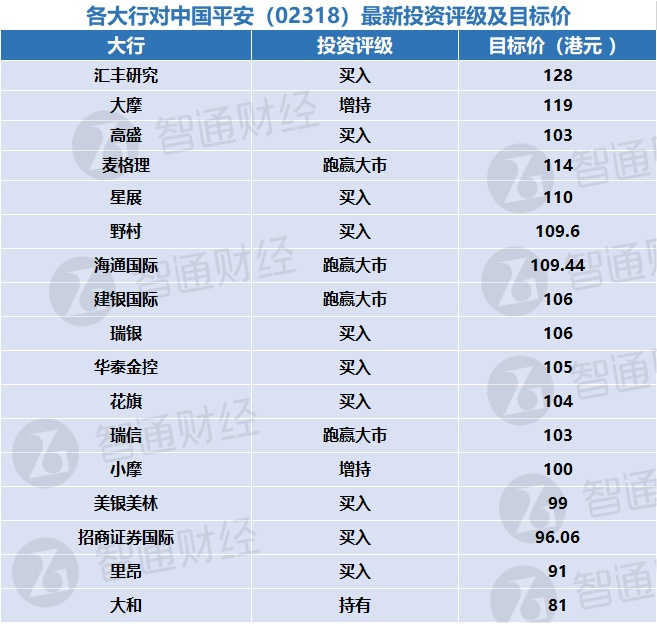 四、各大行对中国平安(02318)最新投资评级及目标价