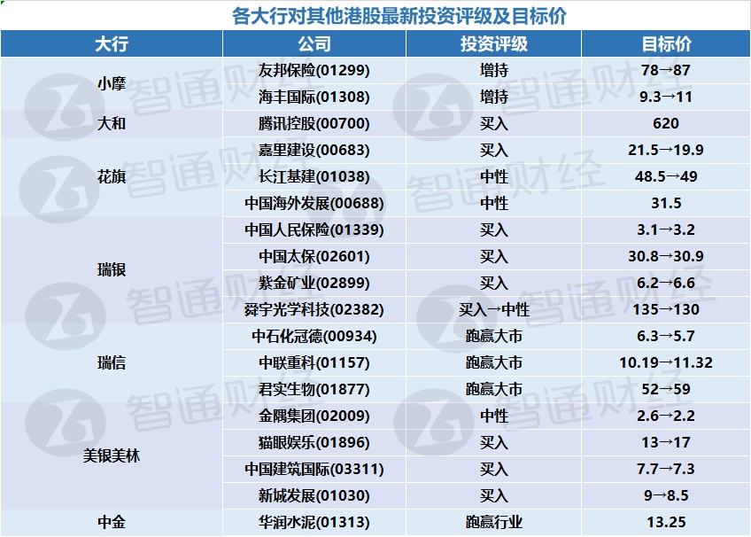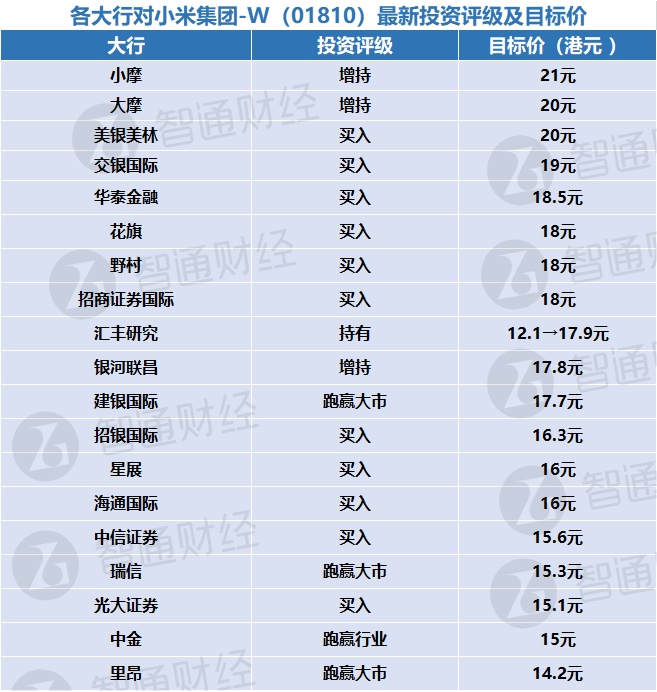 一、各大行对小米集团-W(01810)最新投资评级及目标价