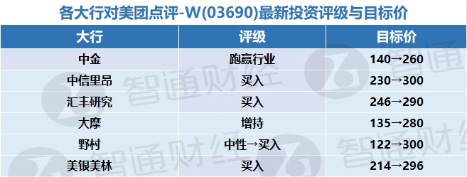 六、各大行对美团点评-W(03690)最新投资评级与目标价