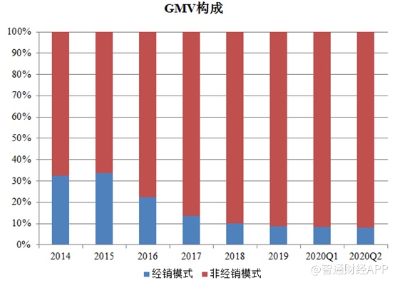 2020年高质量成长战略的效用得以释放。Q2数据显示,GMV构成中非经销模式达到了91.9%,同比、环比持平,服务收入占营业收入的比例56.9% ,同比、环比都有提升。