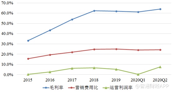 从营收结构可以看出,2016年之后非经销模式GMV构成比例明显增加,2018年之后达到了90%左右,同期内与非经销模式相关的服务收入营收比例也超过了产品收入。2018年,宝尊电商的销售毛利率达到了62.3%,创出历史新高,印证了公司经营策略的正确性。