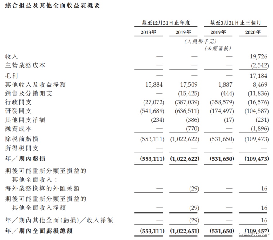 截至2020年3月31日止个月,向五大客户销售的总额分别为1130万元,占收入57.3%。同期,向最大客户销售的金额分别为590万元,占收入30.1%。2018年及2019年公司录得年内亏损分别为5.53亿元、10.22亿元,2020年第一季度,公司录得期内亏损为1.09亿元。