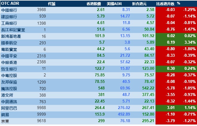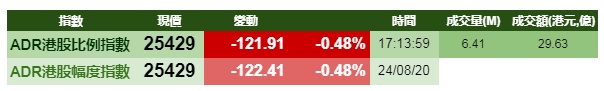 智通财经APP获悉,周一美股标指再创新高,但港股ADR指数全日偏软,按比例计算,收报25429点,跌121.91点或0.48%。