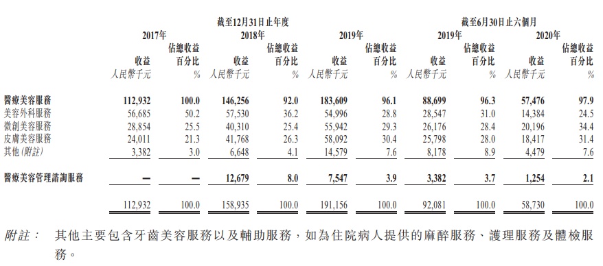 截至2018年12月31日止两个年度,美容外科服务对总收益的贡献最大,分别贡献约50.2%及36.2%。于往绩记录期间,尽管收益持续增长,但美容外科服务占总收益比例逐渐降低,截至2020年6月30日止六个月,美容外科服务占比持续下滑至24.5%。