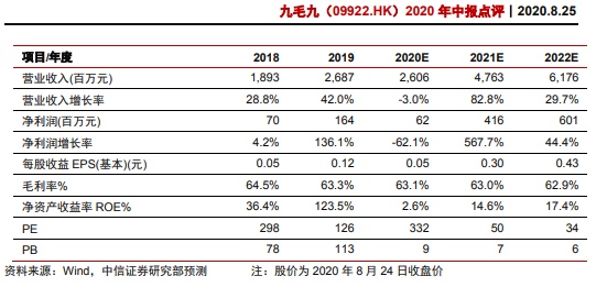 投资建议:卫生事件冲击最大的时点已过,看好下半年增长修复。长期来看,太二品牌的优质模式和公司强大的标准化中餐品牌管理及运营能力是公司保持快速增长的核心基础,九毛九品牌的优化效果仍待观察,但调整后料短期将减轻亏损压力。鉴于公司积极的门店开拓推动增长和优化调整减轻压力,带动经营效益略好于我们预期,上调公司2020年EPS预测至0.05元(原0.03元),维持2021/22年EPS预测为0.30/0.43元,当前价格对应2021-22年PE为50/34倍,给予“买入”评级。