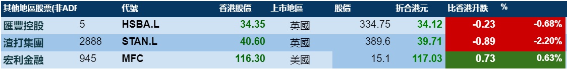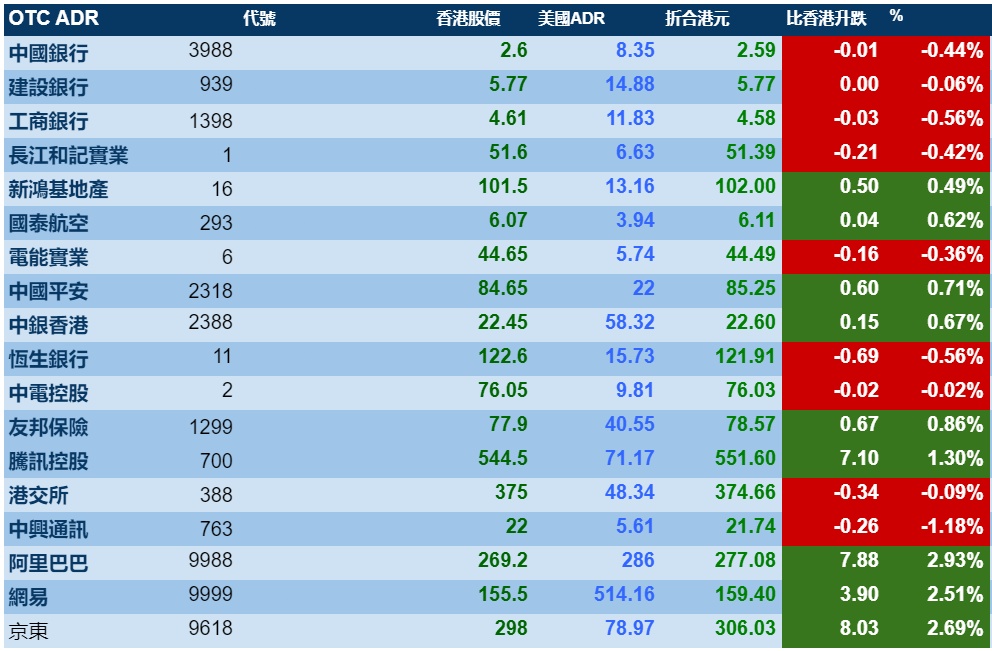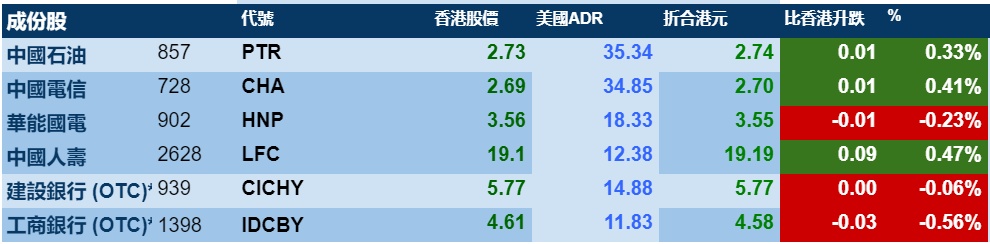 大型蓝筹个别发展,汇丰控股ADR收报34.19港元,较港收市跌0.16港元;腾讯控股收报551.60港元,较港收市涨7.10港元。