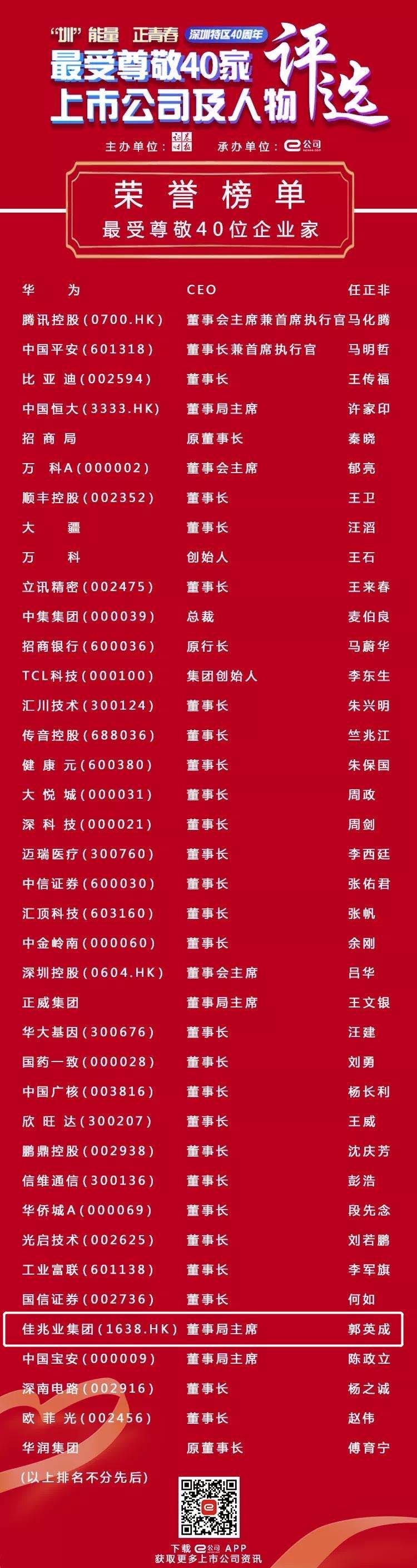 8月26日,由中国证监会指定信息披露媒体《证券时报》发起的“‘圳’能量 正青春”——深圳特区40周年“最受尊敬40家上市公司及人物”评选揭晓,佳兆业集团(01638)荣列“最受尊敬40家上市公司”,佳兆业董事局主席郭英成先生获评“最受尊敬40位企业家”。