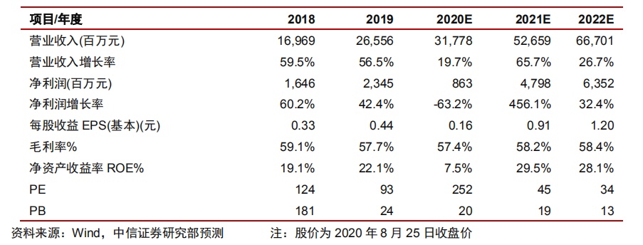 投资建议:鉴于公司积极的门店开拓和良好的经营恢复,带动经营效益略好于我们 预期,调高 2020 年盈利预测至 8.63 亿元,对应 EPS 预测为 0.16 元(原为 0.15 元),维持 2021-22 年盈利预测为 47.98/63.52 亿元,对应 EPS 预测为 0.91/1.20 元,现价对应 PE 为 252/45/34 倍。公司强有力的品牌影响力和经营实力,使其具备 相对较强的抗风险能力,公司有望维持稳健持续的增长和盈利能力,同时公司具备 潜在的业务拓展空间,长期价值明确,继续维持“增持”评级。
