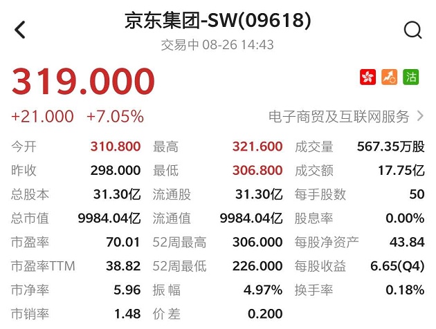 智通财经APP获悉,京东集团-SW(09618)于8月17日公布中期业绩及Q2业绩,超出市场预期。公司股价涨势如虹,近7个交易日股价暴涨超30%,上市两个半月市值激增3000亿港元。该股今日继续飙升,盘中高见321.6港元,市值一度超1万亿港元。截至发稿,涨6.17%,报316.4港元,成交额21.49亿港元。