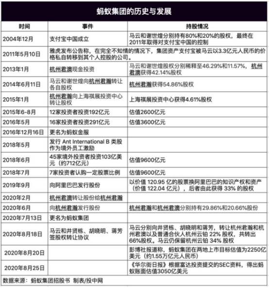 首先是大股东阿里巴巴。马云于2011年将蚂蚁集团的前身支付宝以3.3亿元的价格从阿里剥离。为了补偿股东,蚂蚁与阿里巴巴集团2014年签署了一项协议,上市前阿里巴巴集团有权购买其33%的股权。