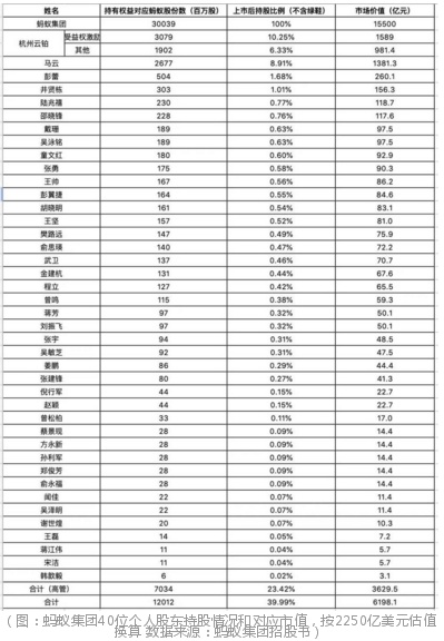 根据招股书,包括马云、彭蕾、井贤栋在内的40位蚂蚁集团和阿里系高管,合计持有约70.34亿股,上市后市场价值约3630亿元。不计算马云个人财富的情况下,蚂蚁上市将诞生至少4位百亿富翁和35位十亿富豪。