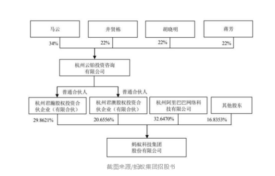 第一是阿里系高管和员工的两大持股平台杭州君瀚和杭州君澳(简称“两君”),合计持有蚂蚁50.52%的股份。