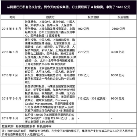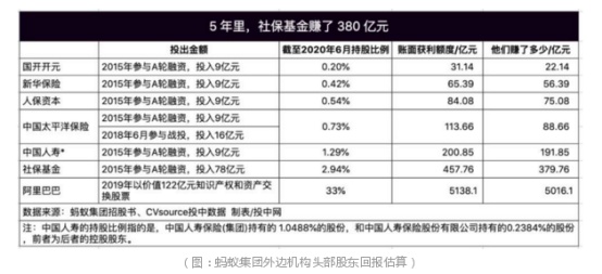 投中网根据蚂蚁集团招股书梳理,从2015年2019年,剔除与阿里巴巴集团的股票和知识产权置换,蚂蚁集团经历了4轮融资,累计拿到了1413亿元的融资。除社保基金外,蚂蚁集团背后的投资人包括国开金融、建行旗下中投海外和建信信托、中国人寿、中邮集团等50位机构投资者。