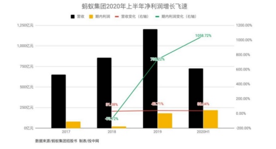 2018年首次利润下滑后,2019年蚂蚁集团实现净利润180亿元,同比2018年增长超7倍,比2017年也增长1倍以上。2020上半年,蚂蚁利润增长再次提速,实现净利润219亿元,超过2019全年。
