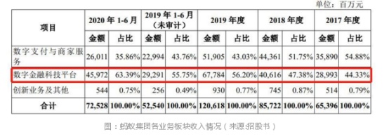 2019年度及2020年1月~6月,数字金融科技平台收入占公司总收入的比例分别达到56.20%和63.39%。