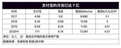 但最近几年,蚂蚁平台的支付交易规模也逐渐触达天花板。2018年数字交易规模从上一年的69万亿元增长至91万亿元,增长率超过30%;2019年达到111万亿,增长率下降至22%。2020上半年虽然在公共卫生事件影响下,数字交易规模依然取得7万亿元增长,但增长率进一步下降。