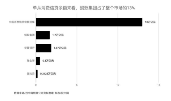 2019年,中国消费信贷余额规模达到13万亿元。单从消费信贷余额来看,蚂蚁集团1.7万亿的规模已经占到整个市场的13%。